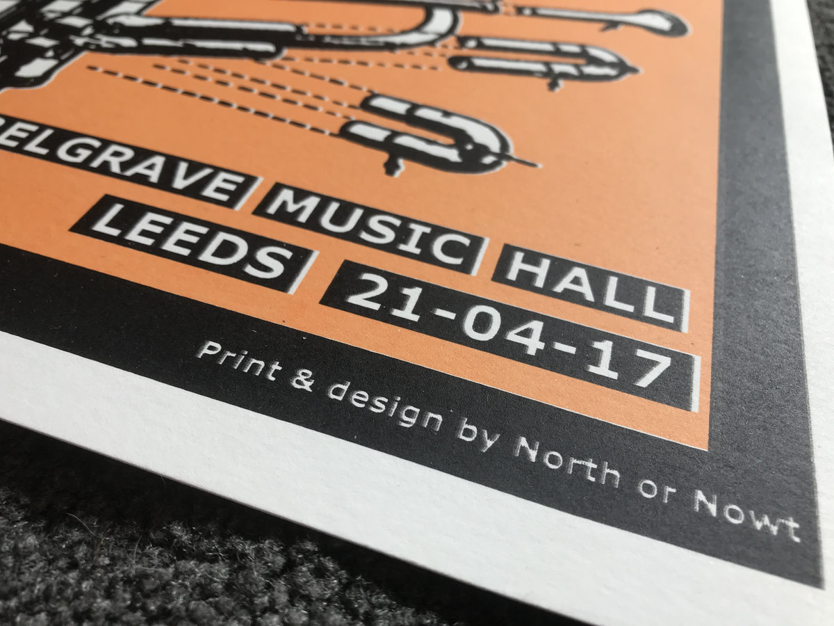 A two-colour screen print by Leeds designer 'North or Nowt', for our Totems launch show at Belgrave Music Hall, 21st April 2017. 43cm x 25cm. Ships with stickers and badges, and a free download of the album.